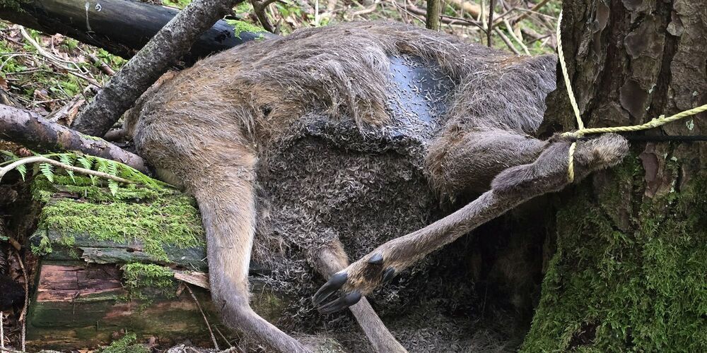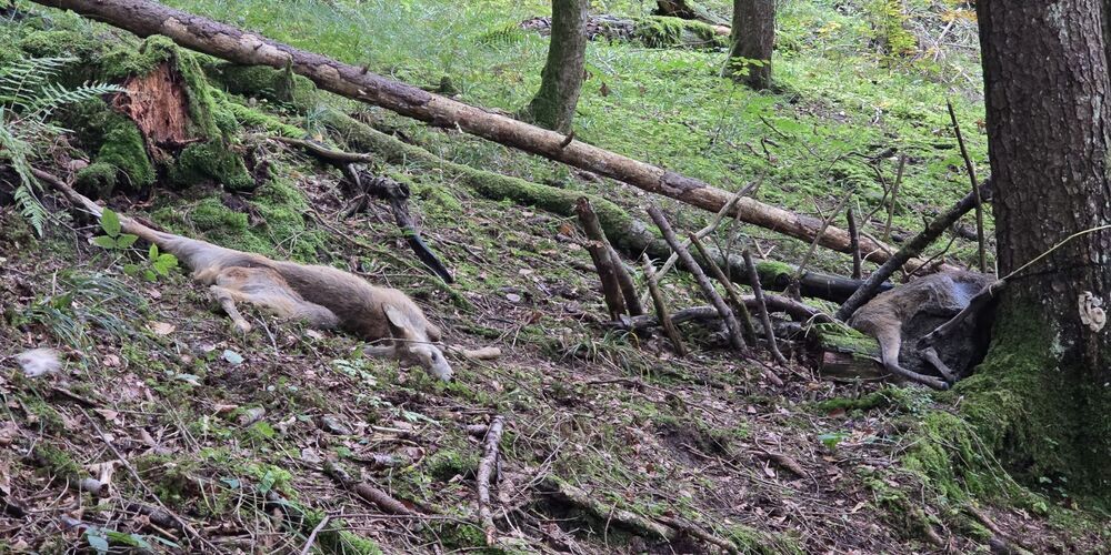 Im Kerngebiet des Chöpfenberg-Wolfsrudels machten zwei Vorstandsmitglieder des Vereins CHWOLF eine schockierende Entdeckung: Ein stark verwester Hirsch und ein frisch aufgebrochenes Reh waren im Wald gezielt vor eine vom Kanton Schwyz angebrachte Fotofalle platziert und festgebunden worden.