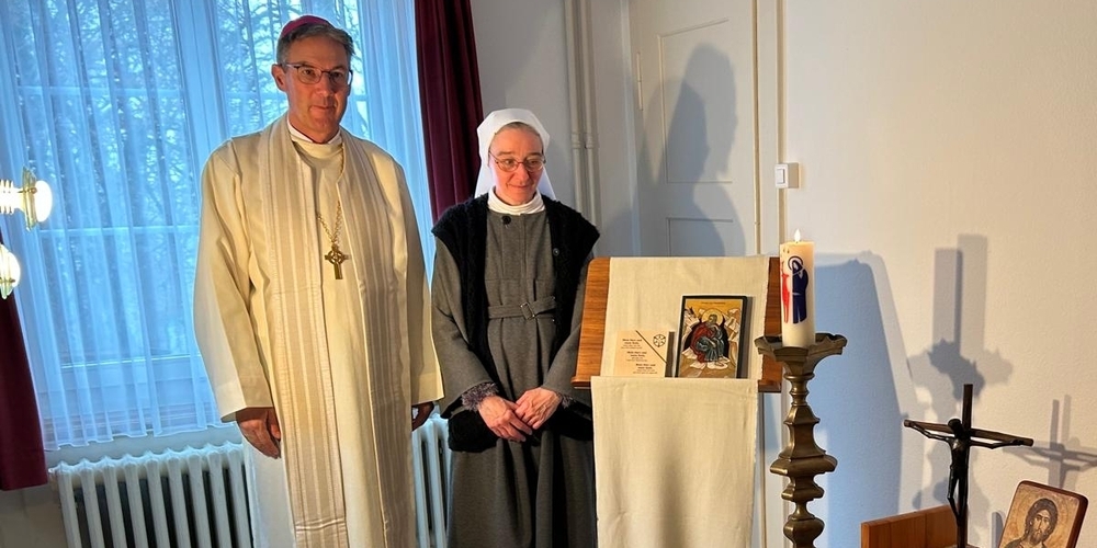 Schwester Maria-Amadea gehört zu den Benediktinerinnen von Cham, spürt aber seit einigen Jahren den Ruf zu einem mehr eremitischen Leben. Vor einem Jahr war sie zum ersten Mal auf der Iddaburg und spürte gleich, dass das für sie ein besonderer Ort ist. Der Gedanke, hier als Eremitin zurückgezogen und im Gebet zu leben und zugleich ein offenes Ohr für andere zu haben, kam auch beim Stiftungsrat gut an. Als Diözesaneremitin lebt Schwester Maria-Amadea ihre Berufung in der Verbindung mit dem Bistum und dem Bischof von St. Gallen. So hat Bischof Beat am Iddafest am 2. November das Postulatsversprechen von Schwester Maria-Amadea entgegengenommen und ihren Gebetsraum im Pfarrhaus, die Eremo des Heiligen Elias, gesegnet. Damit beginnt für die Schwester ein dreijähriger Weg, in die eremitische Lebensform hineinzuwachsen.